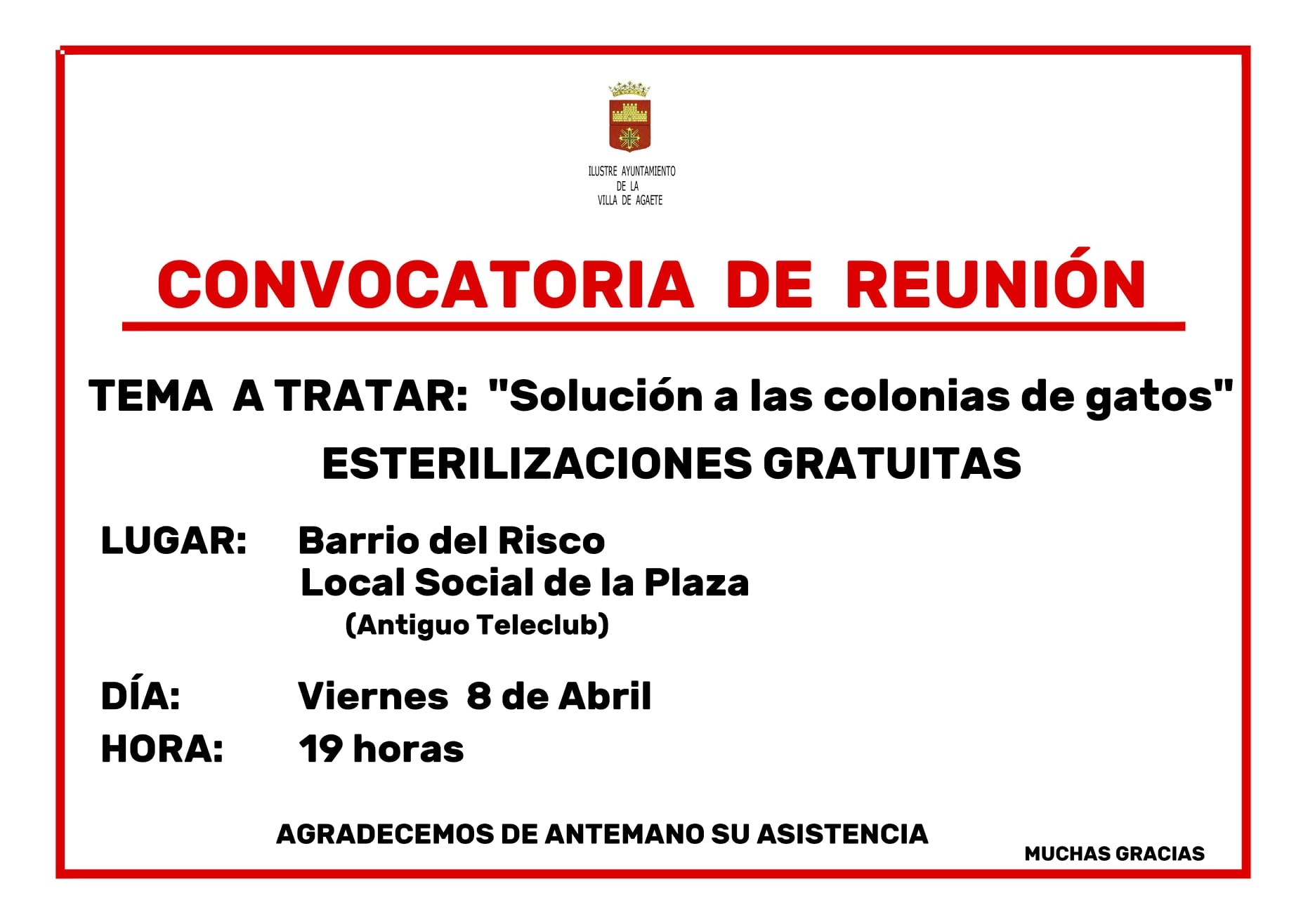 El próximo viernes 8 de Abril, a partir de las 19:00 horas, en el local social de la plaza del Risco, se llevará a cabo una reunión para tratar el tema de la Solución a las Colon