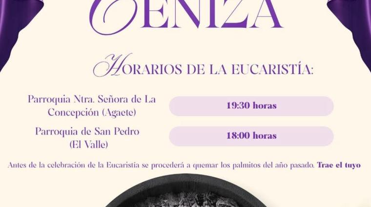 Horarios de Eucaristía para el miércoles de ceniza, 18 de febrero: Parroquia Ntra. Señora de La Concepción (Agaete) : 19.30 horas Parroquia de San Pedro (El Valle) : 18:00 horas