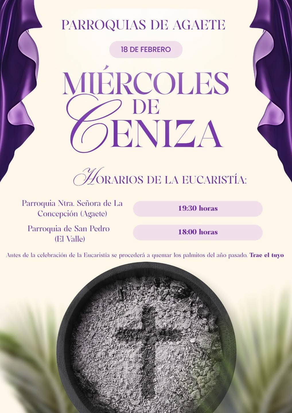 Horarios de Eucaristía para el miércoles de ceniza, 18 de febrero: