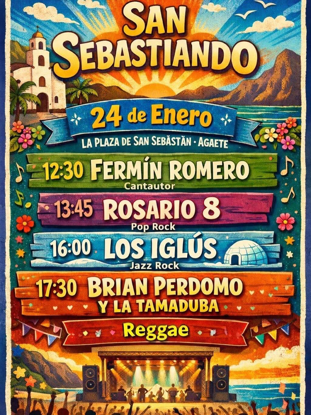 12:30 h. Festival Sansebastiando con los grupos Fermín Romero, Rosario 8, Los Iglús, Brian Perdomo y la Tamaduba.