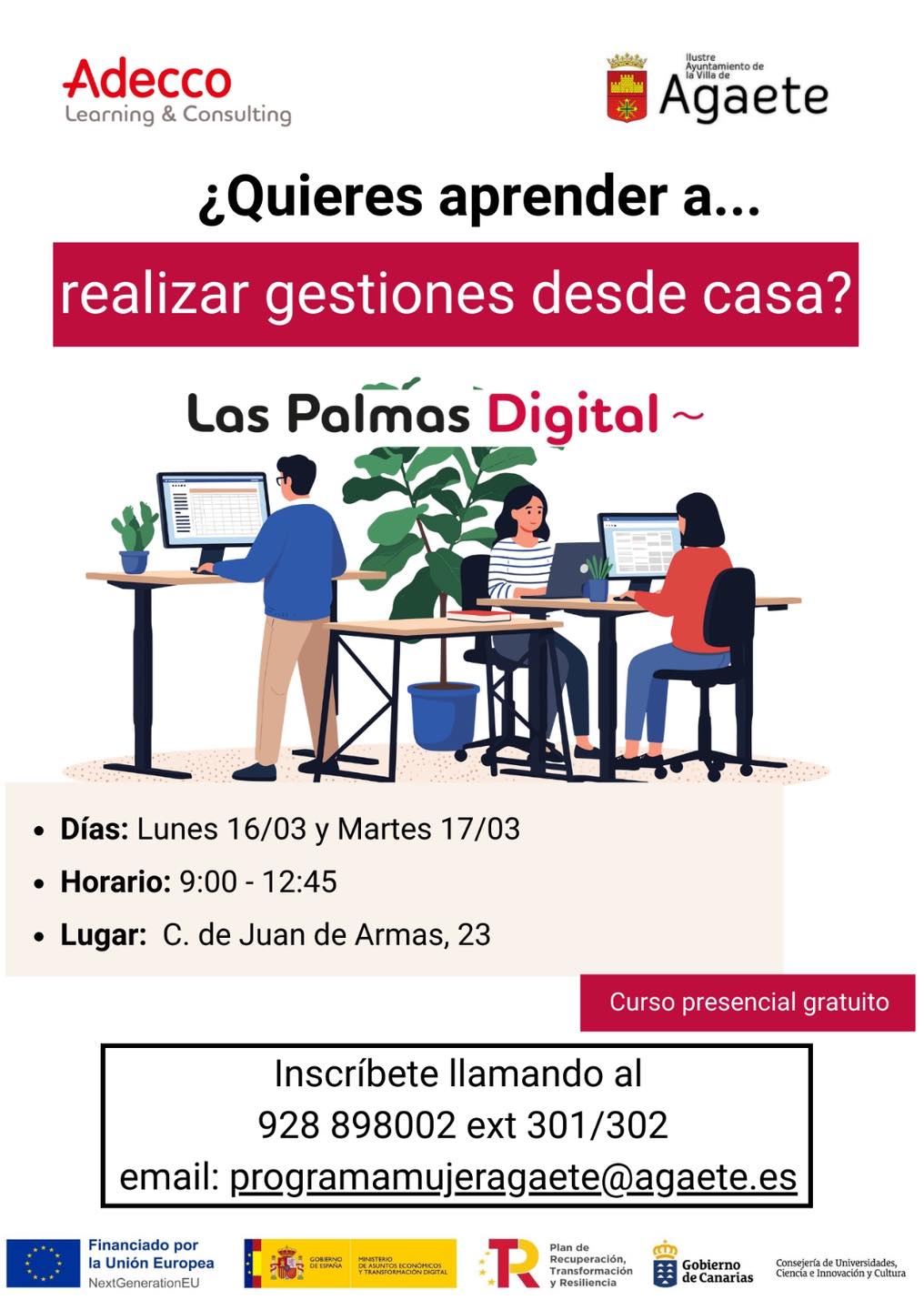 Realiza tus gestiones desde casa, impartida por Adecco, que se llevará a cabo los días 16 y 17 de marzo en el Parque Popular, de 9 a 12.45 horas.