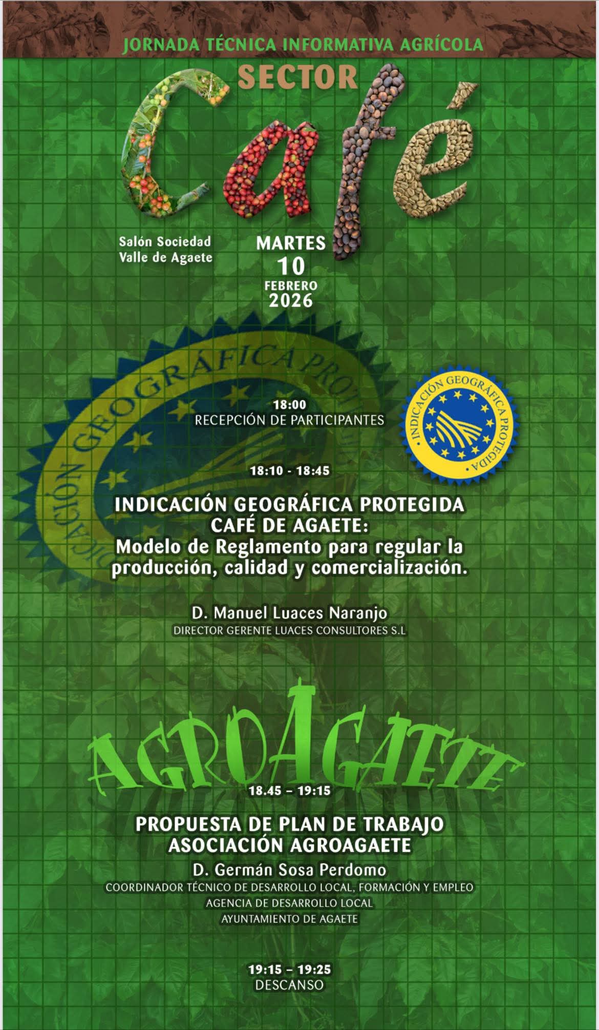 El programa dará comienzo a las 18 horas con la recepción de las personas participantes. A continuación, se abordará la Indicación Geográfica Protegida ‘Café de Agaete’, mediante la presentación de un modelo de reglamento para regular la producción, la calidad y la comercialización del producto, a cargo de Manuel Luaces Naranjo, director gerente de Luaces Consultores S.L.