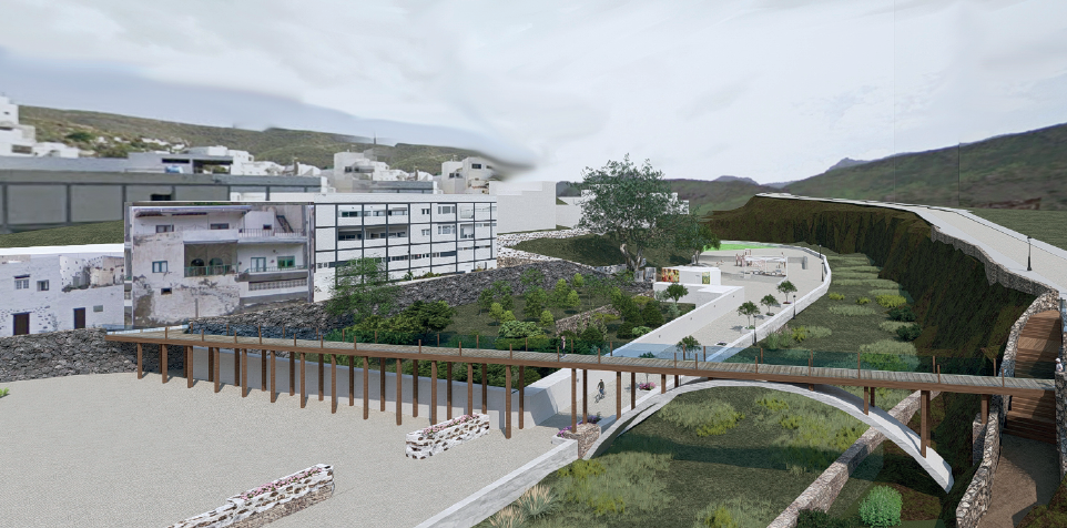 La pasarela peatonal queda así integrada en el entorno del barranco de Agaete, complementando el actual puente de piedra existente.