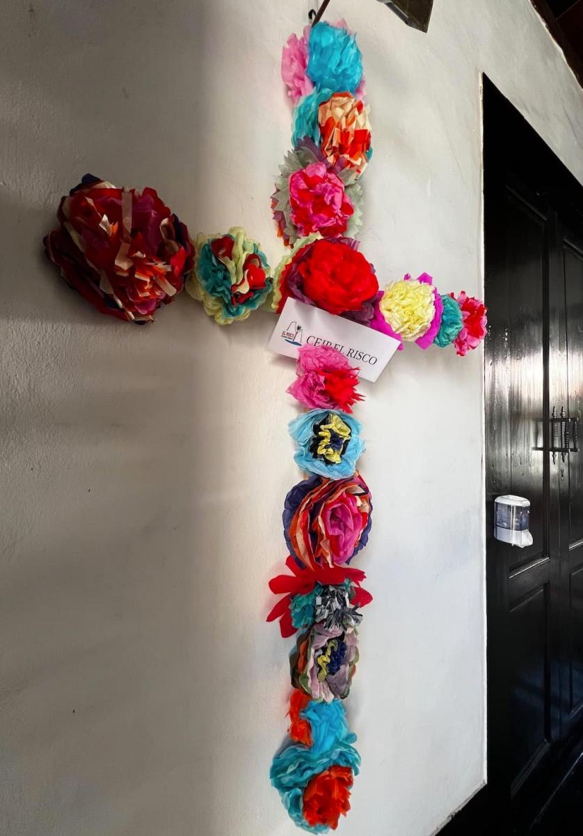 Además, el Ayuntamiento agaetense también ha realizado una cruz para engalanar la fachada de la Iglesia de San Pedro, que está compuesta por flores de papel en tonos naranjas y verdes. Estas flores han sido realizadas en diferentes talleres de manualidades.