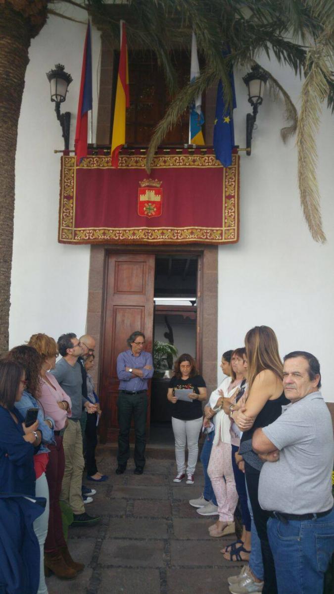 La entrada principal del Ayuntamiento de Agaete ha sido el escenario donde ha tenido lugar la lectura del Manifiesto en contra de la violencia machista que estuvo presidida por el alcalde Juan Ramón Martín y su lectura la realizó la concejala de la Mujer e Igualdad, Hortensia Jiménez.