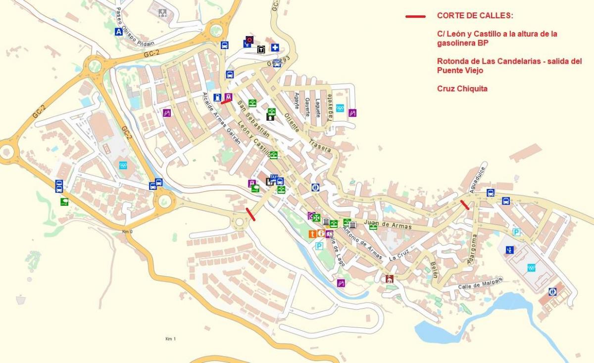 4. El cierre al tráfico en la calle León y Castillo (al lado de la gasolinera BP), Los Arenales (Villa abajo, por la calle Alcalde Esparza Arteche, junto a las oficinas de Gestión de Aguas del Norte) y Glorieta de La Aldea, se realizará el día 30 de marzo a las 11.00 horas aproximadamente, debiendo los vehículos utilizar la vía GC-2 y la travesía de Las Peñas para acceder al Valle (Los Berrazales), centro y parte alta de la Villa.