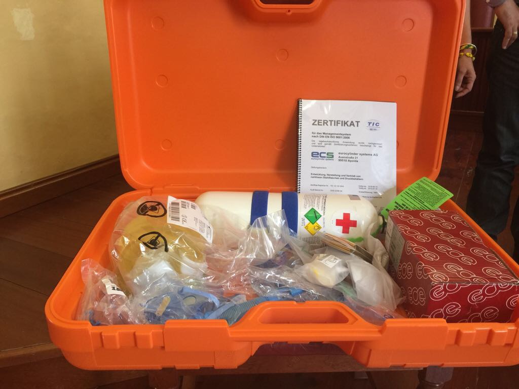 El conjunto del material entregado incluye un collarín adulto multitalla, un collarín pediátrico multitalla, férulas de vacío, férulas hinchables, un maletín de reanimación completo, un resucitador manual pediátrico de PVC, un tensiómetro digital de brazo, un medidor de glucosa y una silla de ruedas plegable.