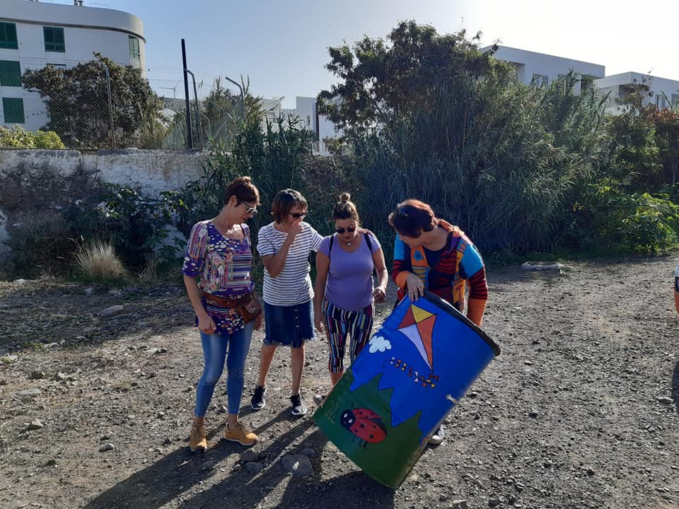 En las imágenes, los concejales Elena Rosario y Acoidán García, las tres monitoras y varios operarios municipales durante la colocación de los vistosos bidones.