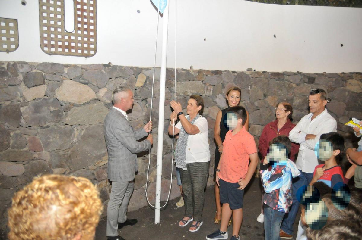 La vecina del barrio, Cándida Rosario Perdomo, ha sido la encargada de realizar la Subida de Bandera, rodeada de todos los familiares y de las vecinas y vecinos de El Risco.