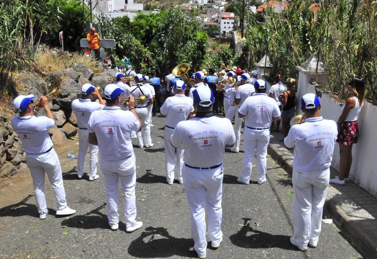 La Banda de Guayedra y la Banda de Agaete fueron turnándose para acompañar a los romeros y papagüevos que danzaron a lo largo de todo el recorrido y que concluiría en la Plaza de San Pedro ante la imagen del patrón de El Valle.
