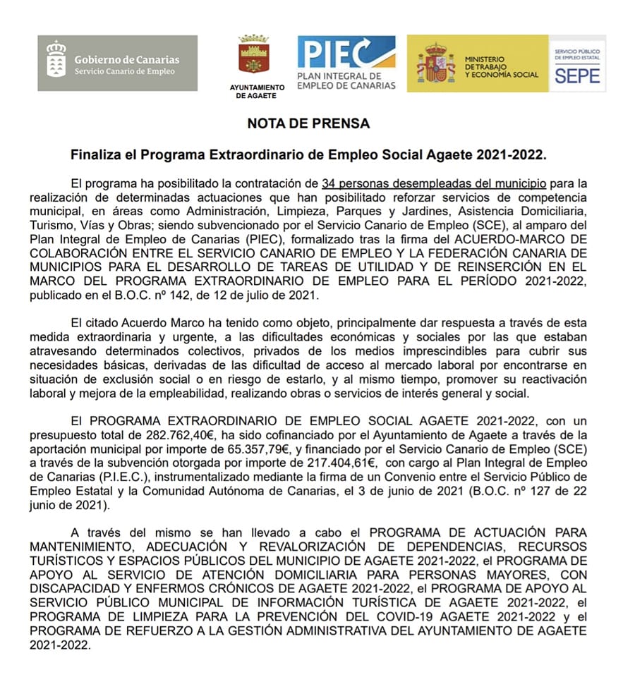 El programa extraordinario de empleo social Agaete 2021-2022, con un presupuesto total de 282.762,40 euros, ha sido cofinanciado por el Ayuntamiento de Agaete a través de la aportación municipal por importe de 65.357,79 euros y financiado por el Servicio Canario de Empleo (SCE) a través de la subvención otorgada por importe de 217.404,61 euros, con cargo al Plan Integral de Empleo de Canarias (P.I.E.C.), instrumentalizado mediante la firma de un Convenio entre el Servicio Público de Empleo Estatal y la Comunidad Autónoma de Canarias, el 3 de junio de 2021 (B.O.C. nº 127 de 22 junio de 2021).