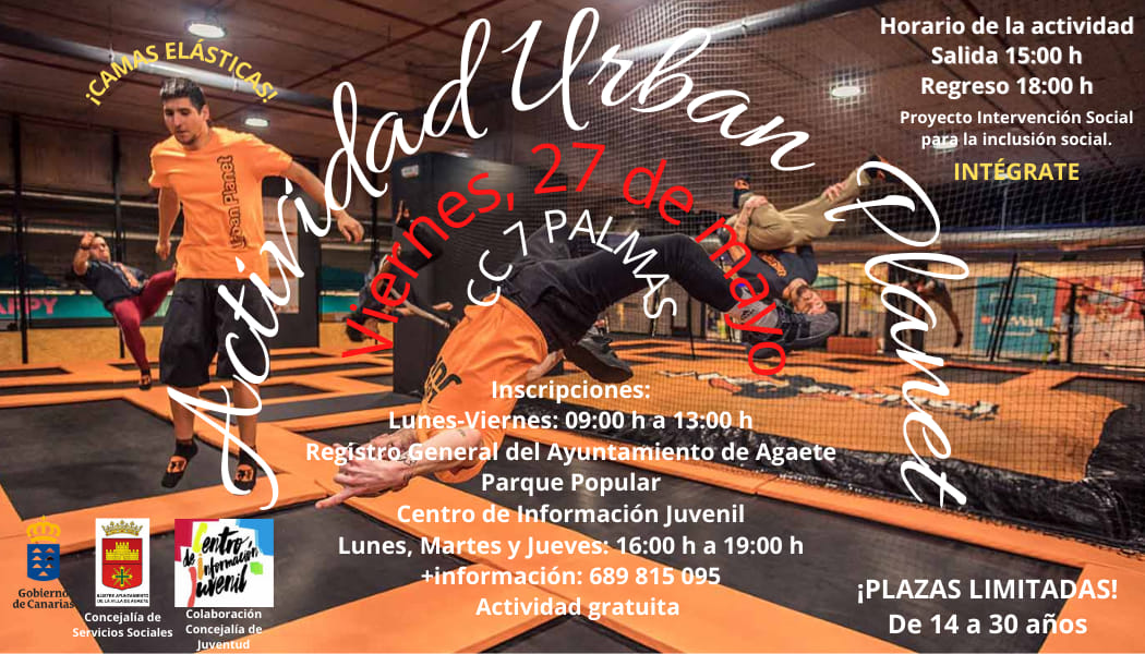 El Ayuntamiento de Agaete a través de la Concejalía de Servicios Sociales y la Concejalía de Juventud, organiza la actividad "Urban Planet Jump, Camas Elásticas, enmarcada en el programa de Intervención Social para la Inclusión Social" Integrate", subvencionado por la Consejería de Derechos Sociales, Igualdad, Diversidad y Juventud del Gobierno de Canarias y el Ayuntamiento de Agaete.