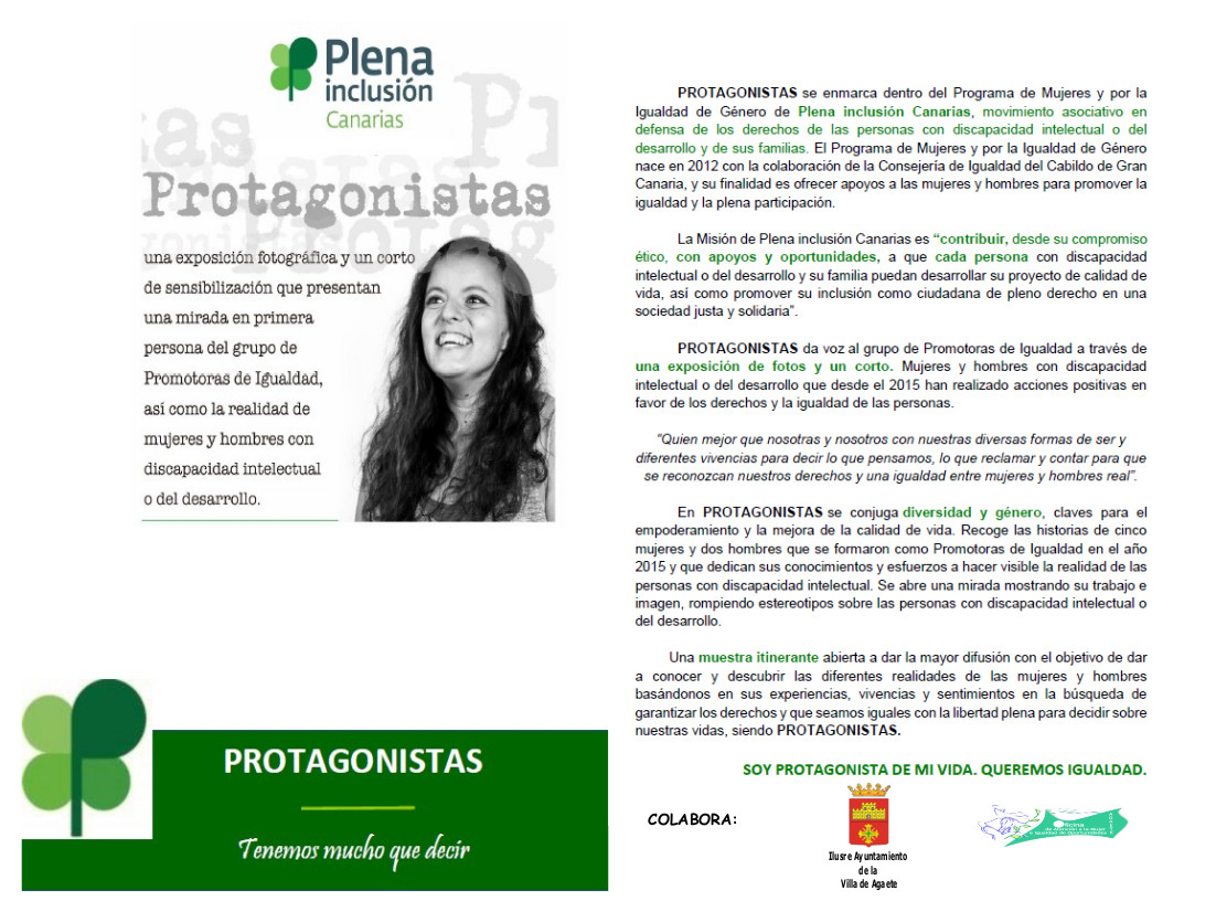 ‘Protagonistas’, de la Asociación Plena Inclusión Canarias, recoge las historias de cinco mujeres y dos hombres que se formaron como promotoras de igualdad en el año 2015 y que dedican sus conocimientos y esfuerzos a hacer visible la realidad de las personas con discapacidad intelectual.