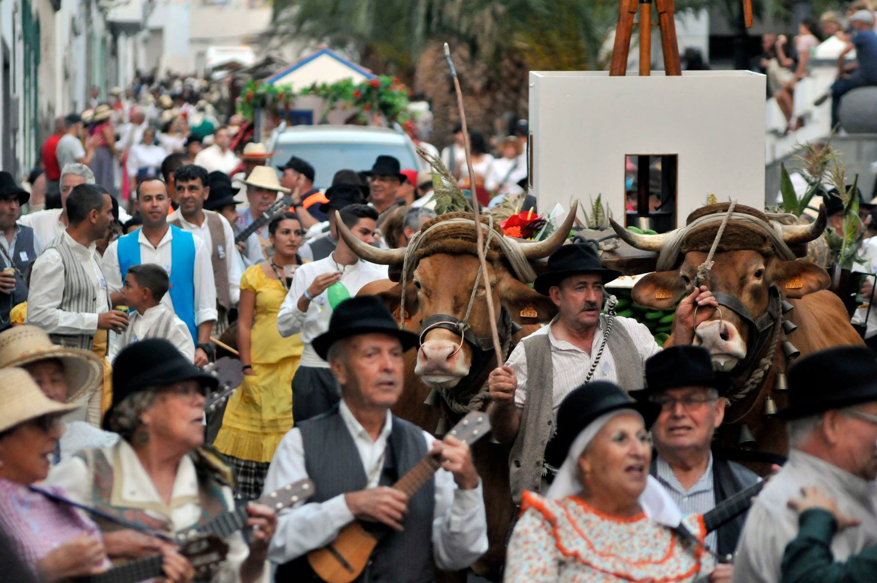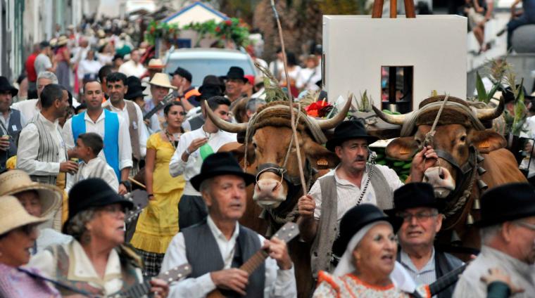 Agaete ha congregado a miles de vecinas y vecinos ataviados con sus mejores galas típicas canarias y acompañadas por carretas cargadas de alimentos, música y