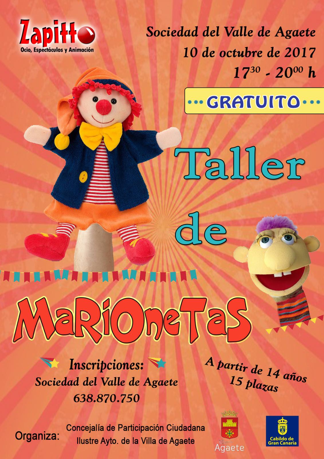 El Ayuntamiento de Agaete, a través de la Concejalía de Participación Ciudadana, organiza el Taller de Marionetas gratuito que impartirá la empresa Zapitto, Ocio, Espectáculos