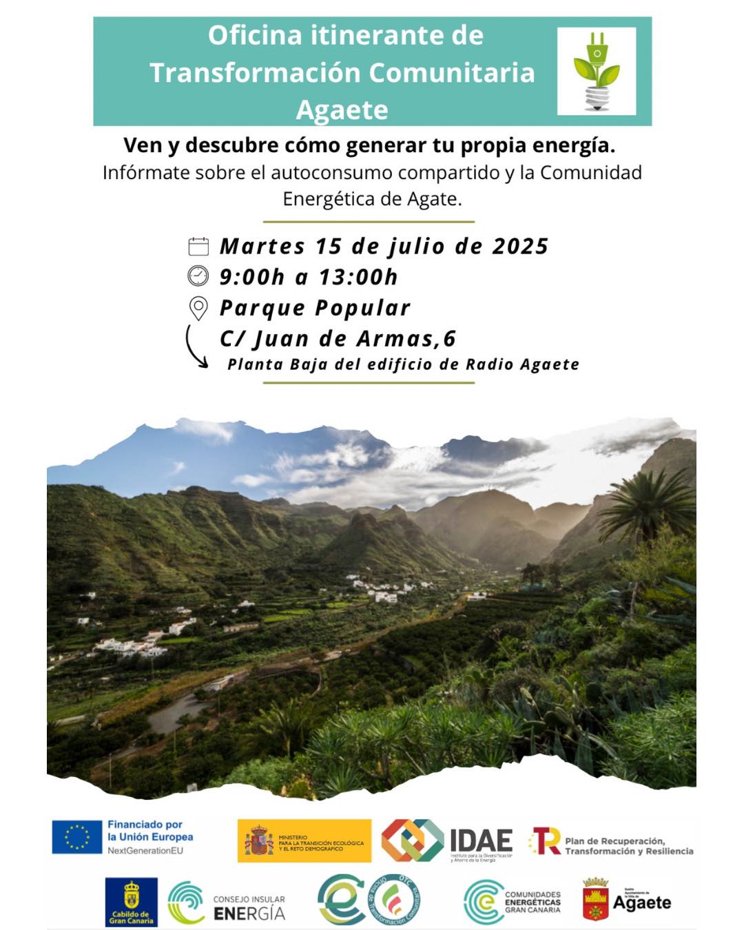 De 9 a 13 horas en el Parque Popular recibimos a la Oficina itinerante de Transformación Comunitaria Agaete con ‘Ven y descubre cómo generar tu propia energía’.