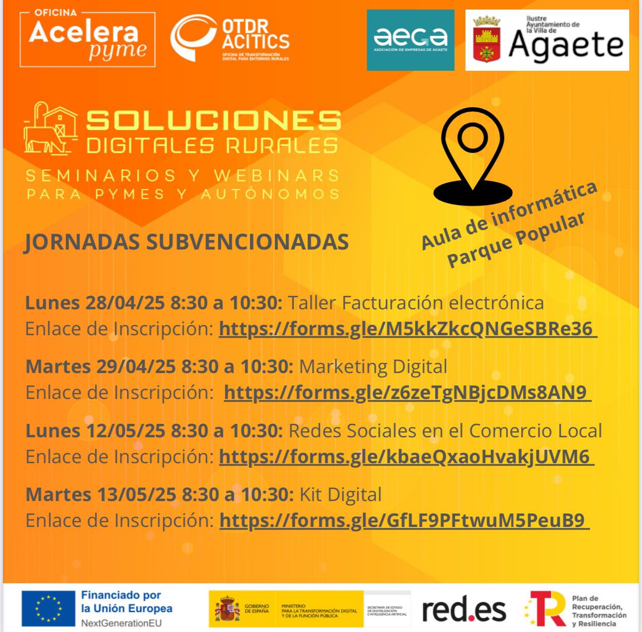 Te invitamos a participar en estas jornadas subvencionadas dirigidas a pymes y personas autónomas, organizadas por la Oficina Acelera Pyme y AECA, con el apoyo del Ayuntamiento de Agaete.