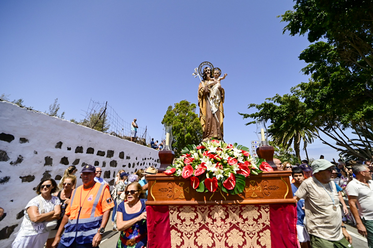 La imagen de San José salió desde el centro del pueblo al encuentro de Nuestra Señora de las Nieves, y el punto donde ambas figuras se cruzan, entre reverencias solemnes, se convirtió en un instante lleno de emoción. Desde allí, avanzaron juntas entre aplausos, la música de la Agrupación Musical Guayedra y la Banda de Agaete y una multitud entregada.