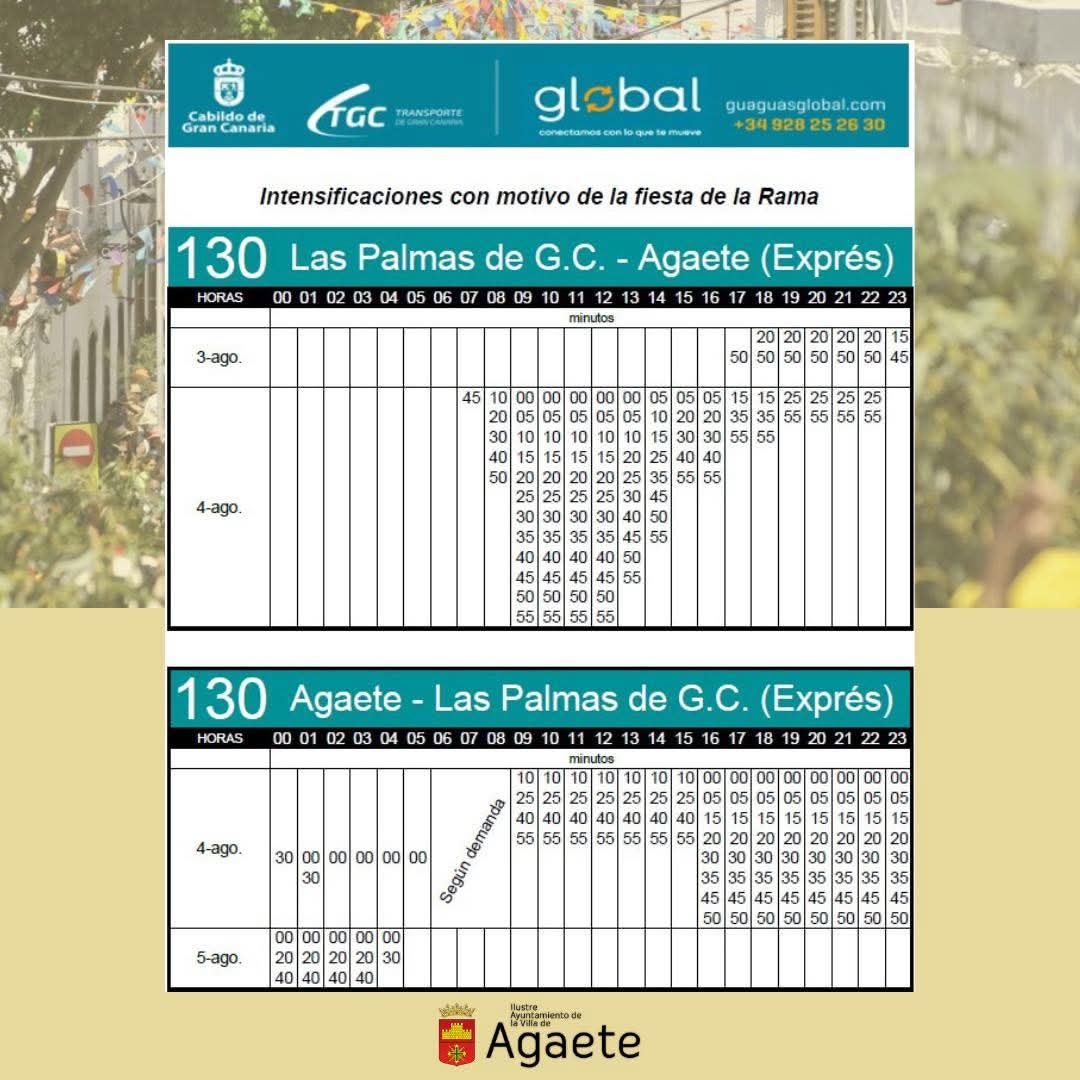 Desde el Ayuntamiento de Agaete, recomendamos el uso de transporte público para disfrutar de la fiesta de La Rama, ya que el aparcamiento estará extremadamente limitado en estos días.