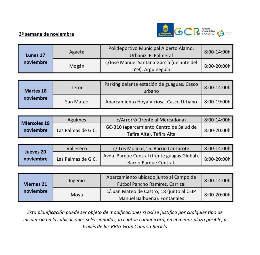 El Cabildo de Gran Canaria a través del programa Gran Canaria Recicla informa de la planificación de los Puntos Limpios Móviles prevista para el mes de noviembre de 2025, con dos jornadas en el municipio de Agaete.