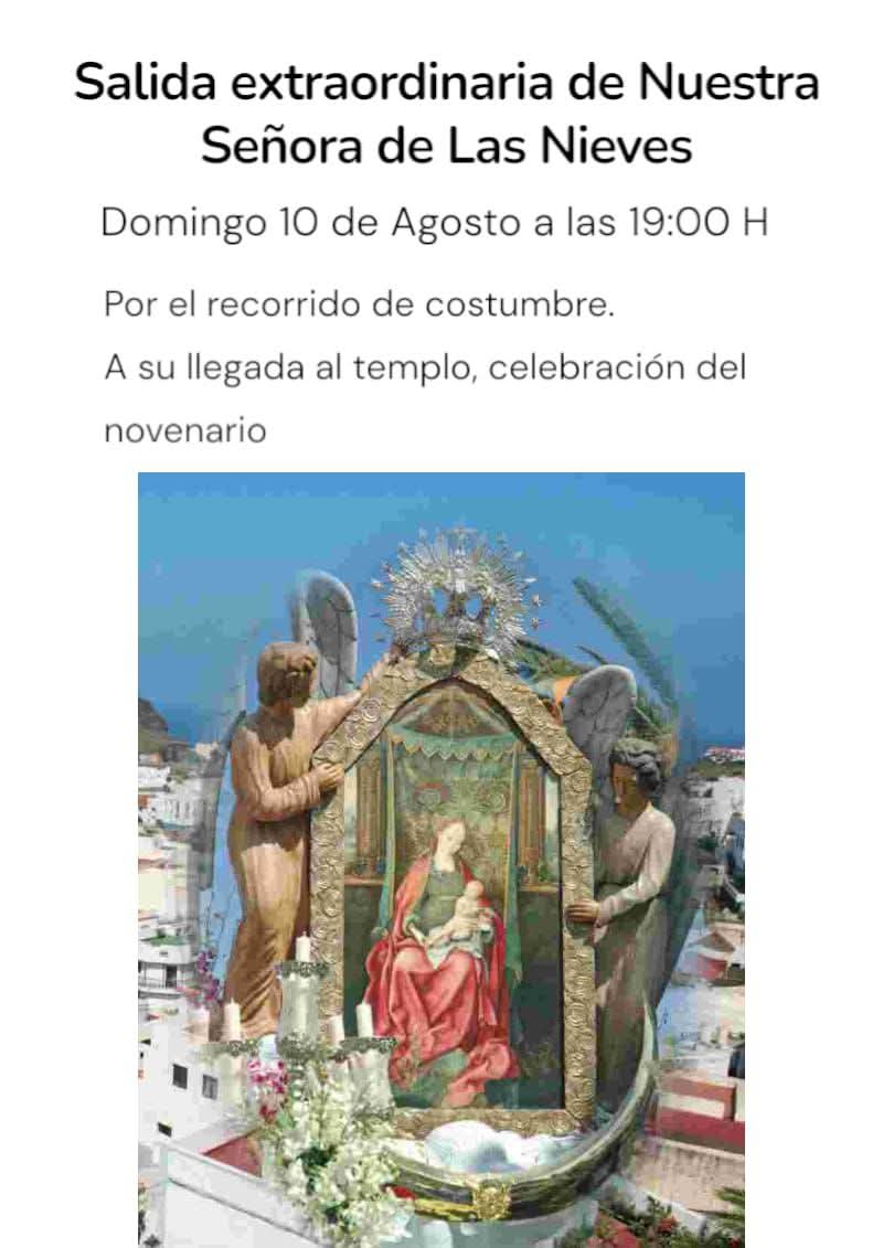 Debido a la alerta por altas temperaturas, el Ayuntamiento de Agaete, la Parroquia y la Policía Local, han acordado que la procesión de Nuestra Señora de las Nieves en su recorrido por el casco, se realizará este domingo día 10 de agosto, a partir de las 19 horas.