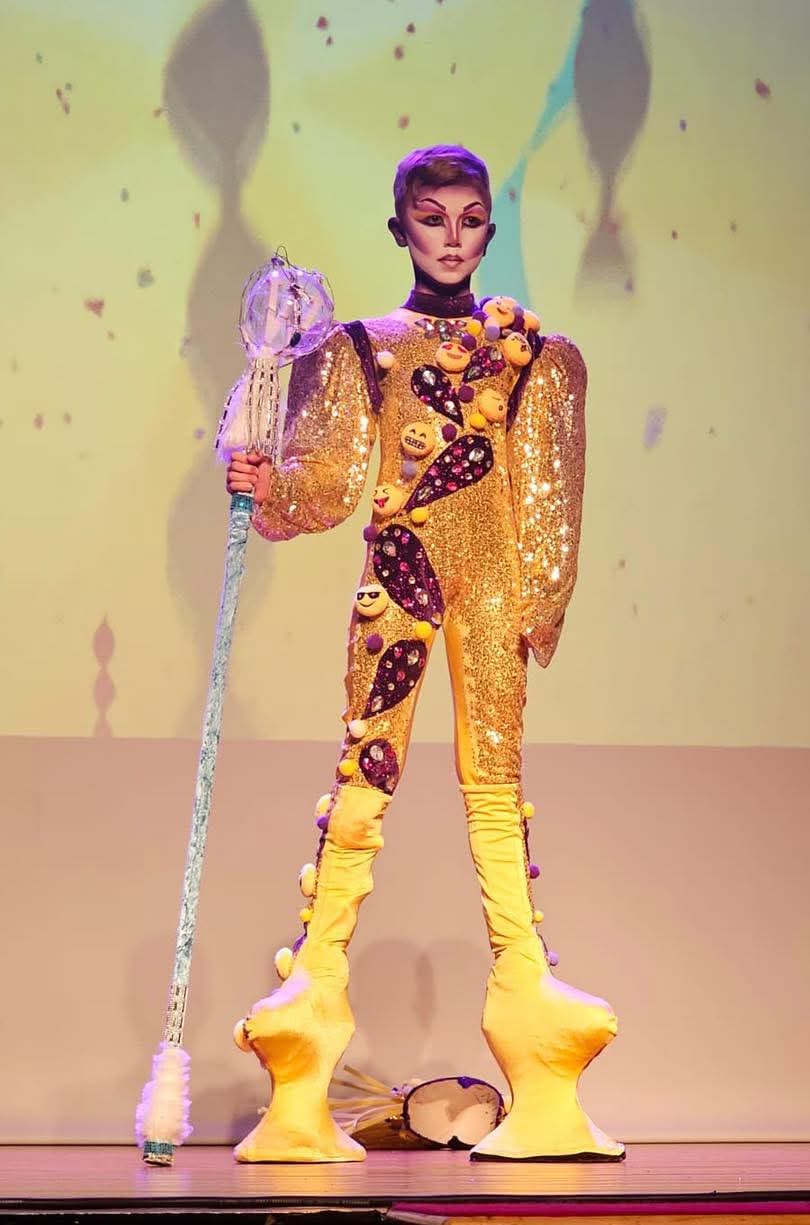 Su espectáculo, de tres minutos de duración, finaliza con hip-hop, su estilo favorito, y lo presenta acompañado por dos bailarinas de su escuela. Actúa con una fantasía creada en Arucas, con un tocado en tonos lila y amarillo, plataformas de 25 centímetros —regalo de los Reyes Magos esta Navidad— y detalles llenos de brillo e inspiración, con guiños a referentes como drag Kálik de Gáldar o drag Hefesto, también de Gran Canaria, que son los que por ahora son los artistas que más le gustan.