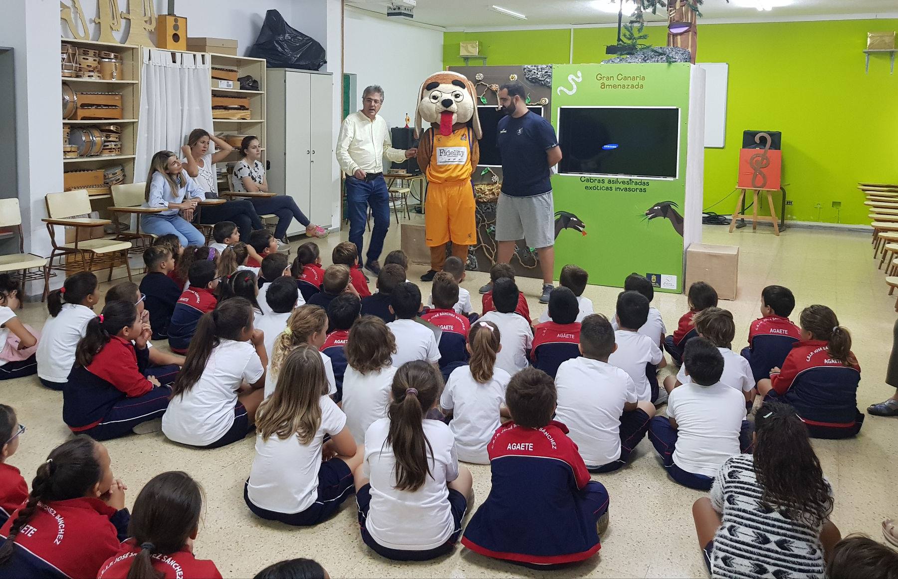 La Escuela Club Baloncesto Gran Canaria – Agaete ha comenzado en la mañana de este lunes con la entrega de la información al alumnado del CEIP José Sánchez y Sánchez y el CEIP Ana María Betancor, de la mano de su coordinador, Jaime Pérez, y Granky, la mascota del club.